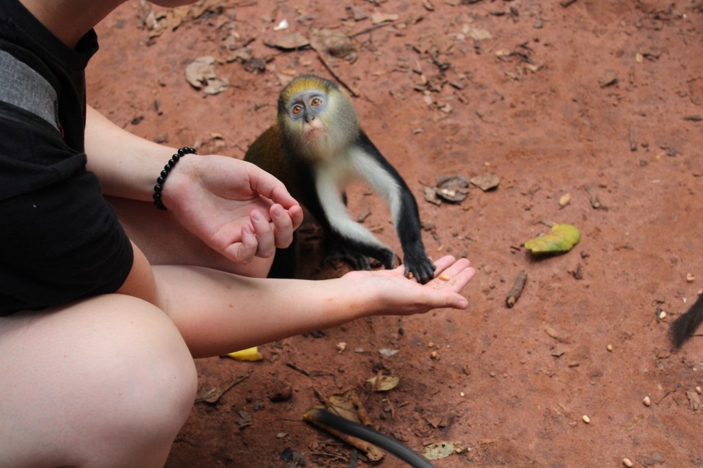 Vor drei Wochen, Ende Oktober, waren wir vier Mädels in Kintampo und haben uns dort die Kintampo-Waterfalls und ein Monkey Sanctuary angeschaut. Die Fahrt hat wieder viel Zeit in Anspruch genommen, weshalb wir schon am Freitag aufgebrochen sind. Erstmal drei Stunden mit dem Trotro nach Techiman, der nächsten großen Stadt nördlich von Offinso, und dann mit dem Taxi zu dem Monkey-Sanctuary in Boabeng. Dabei handelt es sich um einen geschützten Wald, in dem Gruppen von Monameerkatzen und den größeren Mantelaffen leben. Ein Guide hat uns durch den Wald geführt und wir konnten die Monameerkatzen mit Bananen und Nüssen füttern.