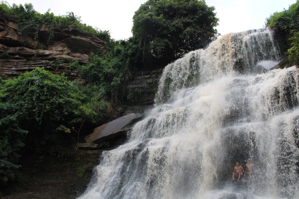 Dort hatten wir uns zwei Zimmer in einer Lodge gebucht, bei der großzügigerweise sogar ein Teller Frühstück pro Zimmer inklusive war. Das Gelände der Wasserfälle ist in Privatbesitz und wie ein Park angelegt, auf dessen Rasenflächen beispielsweise Gottesdienste stattfinden. Zu den Wasserfällen hat uns auch ein Guide begleitet, der uns hinterher erzählt hat, dass er auch längere Wanderungen im Umkreis anbietet und die Fotos von Höhlen und Felsen sahen echt cool aus. Vielleicht machen wir das irgendwann mal. Auch die Tour zu den Wasserfällen ging viel zu schnell vorbei, aber besonders der Größere der beiden sah schon ziemlich beeindruckend aus. Justice, der Guide, hat fleißig Fotos von uns gemacht, aber es war etwas schwierig zu verhindern, dass die badenden weißen Touristen mit drauf waren.