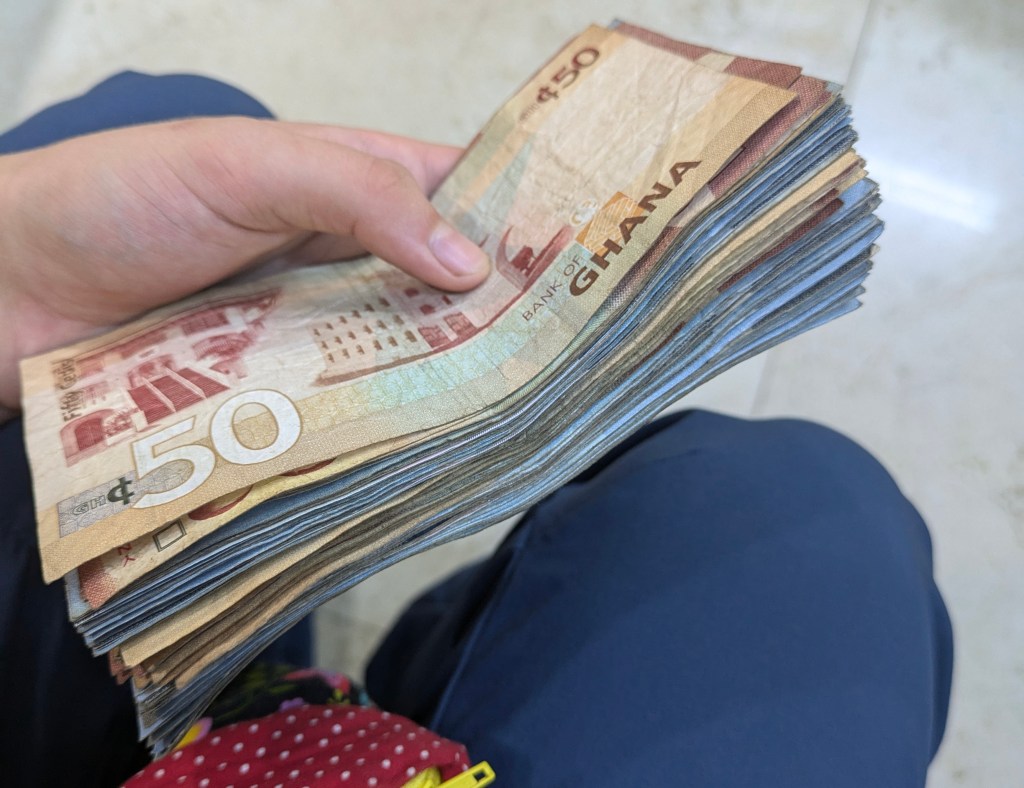 Am nächsten Wochenende waren wir gleich wieder unterwegs: Da haben wir unsere Residence und Work Permit beantragt. Am Donnerstagmorgen sind wir nach Accra aufgebrochen und haben erst am Abend vorher mit Zac unsere Dokumente zusammengesucht. Weil Stromausfall war, konnten wir die vergessenen Sachen, wie zum Beispiel meinen Lebenslauf, nicht mehr ausdrucken, aber das war laut Zac kein Problem. Er kennt jemanden aus dem Immigration-Office, die uns die Permit ausstellt und so konnten wir ihr auch noch im Nachhinein ein paar vergessene Dokumente zukommen lassen. An der VIP-Bussstation in Accra hat uns wieder Dauda in Empfang genommen. Er wieder nur zwei Worte mit uns gewechselt und uns ein Taxi zum Immigration Office organisiert. Die Permit kostet 6400 Cedi, was etwa 380 Euro entspricht. Da der Automat uns das Geld als 100er- und 50er-Scheine ausgespuckt hat, war das wirklich ein Batzen Geld und ich habe mich beinahe so gefühlt, als ob ich etwas Verbotenes tue.