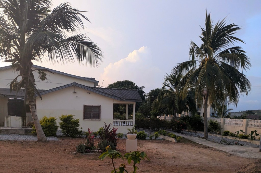 Wegen den völlig verstopften Straßen in Accra, war ich erst um 17:30 Uhr in meiner Unterkunft. Und natürlich lief wieder nicht alles glatt: Erstmal war die Lodge auf Google Maps auf einem anderen, verlassenen Gebäude verzeichnet, aber ich habe zum Glück jemanden gefunden, der mir den Weg gezeigt hat. Dann war niemand Zuständiges auf dem Gelände und der Gärtner musste die Rezeptionistin anrufen, die erst eine halbe Stunde später da war. Und die wiederum musste ihren Chef anrufen, weil sie nicht wusste, wie viel ich zahlen muss. Er wusste es auch nicht und so habe ich den US-Dollar-Preis aus meiner Buchungsbestätigung online umgerechnet. Das Zimmer entpuppte sich als ganze Ferienwohnung mit Sofa, Esstisch, Fernseher, Bad und ghanaischer Küche, die ich aber möglichst nicht betreten habe, weil dort Kakerlaken rumliefen und der Kühlschrank geschimmelt hat. Aber ansonsten war es echt gut. War ein schönes Gefühl, nach zwei Monaten mit ständig Menschen um mich herum, mal richtig alleine zu sein. Die Rezeptionistin war super nett und hat mir sogar noch ein Taxi bezahlt, das mich zu einem Restaurant gefahren hat, sodass ich mir noch etwas zu essen kaufen konnte. Sie war sehr darauf bedacht, dass ich ihr eine gute Bewertung da lasse.