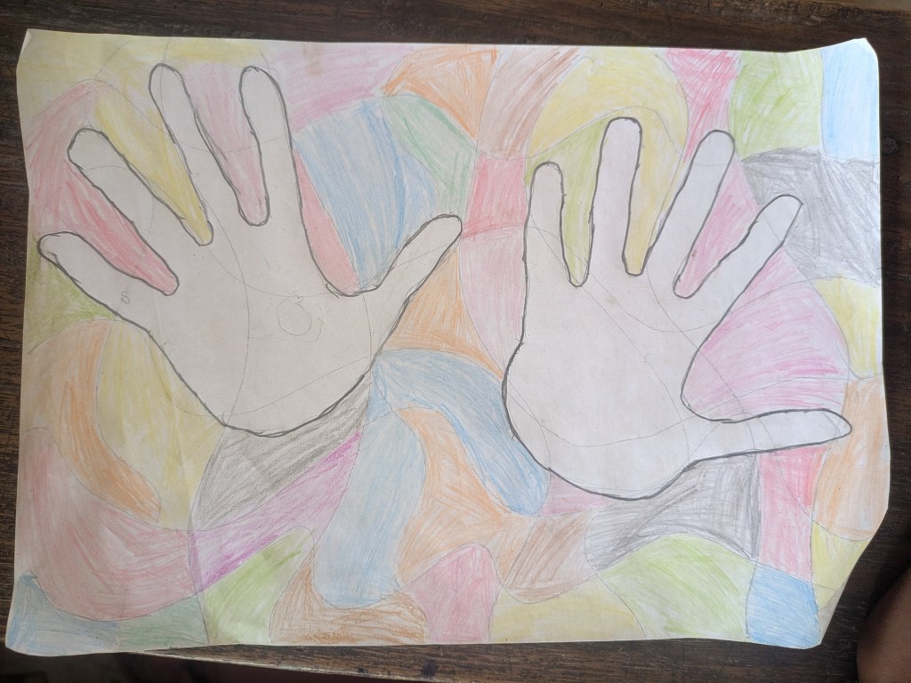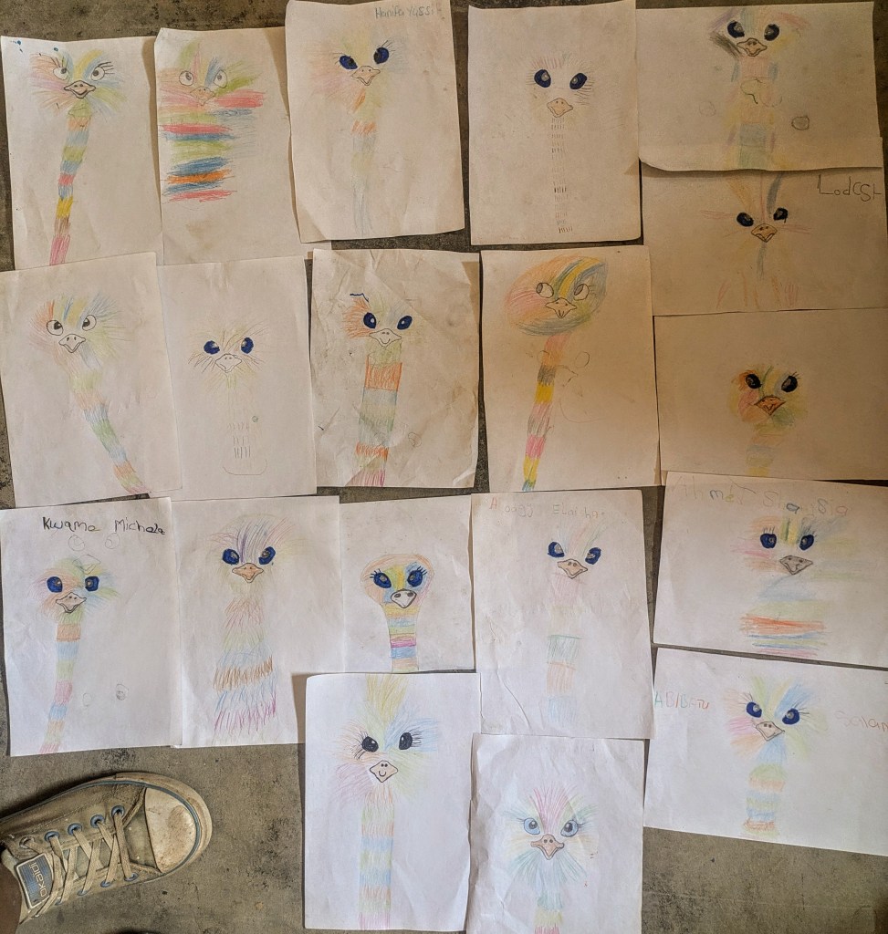 Am Donnerstag war der letzte Schultag und auch schon am Mittwoch war in der Schule nicht mehr viel los. Alle Klausuren waren geschrieben und Eric hatte nichts weiter geplant, außer den Schülern die Noten zu geben. Also habe ich wieder meine Buntstifte und ein paar Mal-Ideen mitgebracht und wir haben Creative Arts gemacht. Darüber freuen sich besonders die Jungs, was ich richtig schön finde. Wir haben auch ein Bodypercussion-Stück mit drei verschiedenen Rhythmen zusammen gemacht, das ich auf Youtube gefunden habe. Nach ein bisschen Übung hat das auch ganz gut funktioniert. Und ich wollte mit ihnen Menschen-Memory ausprobieren. Es hat mich überrascht, dass das Prinzip allen recht schnell klar war, aber es wurde trotzdem total chaotisch, weil es vielen glaube ich zu langweilig war, dazusitzen und zuzuhören. Trotz der Lautstärke haben wir es bis zum Ende geschafft. In der zweiten Runde wollten zwar alle Raten, aber niemand als Memorykarten herhalten: Die meisten Mädchen sind auf dem Schulhof verschwunden und die Jungs fanden das Handyspiel von Eric interessanter. Aber ich habe nicht versucht, sie aufzuhalten, weil ich an dem Tag etwas mit ihnen machen wollte, das allen Spaß macht und nicht anfangen, groß herumzuschreien (das habe ich in der ersten Runde schon genug gemacht). Deshalb habe ich mit den vier verbleibenden Kindern ein Lied gesungen, das ich aus dem Chor kannte (den Mango-, Kiwi-, Ananas- und Bananen-Kanon) und anschließend noch ein Creative Arts-Projekt mit ihnen angefangen. Da sind dann nach und nach wieder alle angekommen.