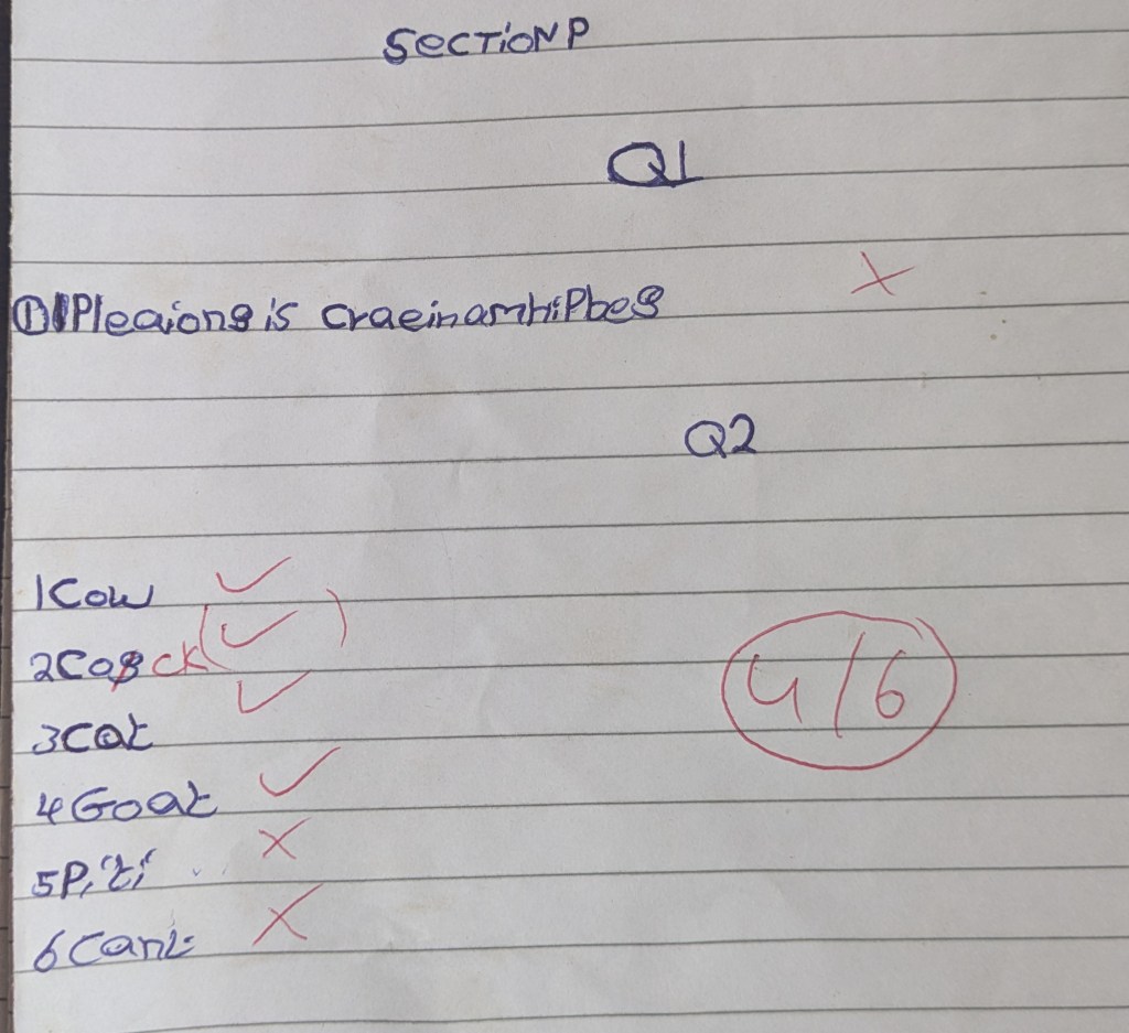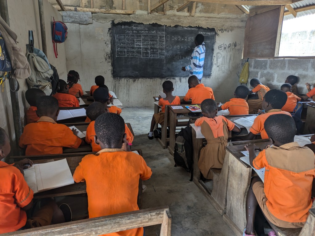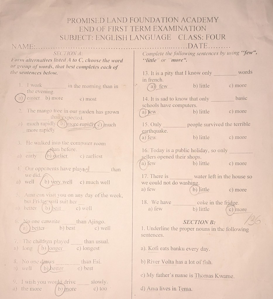 Insgesamt hat meine Klasse in neun Fächern Klausuren geschrieben. In der ersten Woche haben wir Science, History, R.M.E (religious and moral education), English Language, English Writing und Mathe geschrieben. Diese Woche waren noch I.C.T (information, communication, technology), Creative Arts, O.W.O.P (our world, our people) und Twi dran. Ich hatte mich schon wirklich gefragt, wie meine Klasse eine Klausur schreiben soll, wenn nur sechs Schüler lesen und schreiben können und noch nicht einmal die Hälfte gut Englisch versteht. Und es ist wirklich verrückt. Der erste Teil der Klausuren besteht aus Multiplechoice-Aufgaben. Da raten viele einfach und beim Korrigieren habe ich festgestellt, dass sie wahrscheinlich teilweise voneinander abschreiben. Und im zweiten Aufgabenteil müssen dann die Antworten hingeschrieben werden. Das hat Eric aber geschickt umgangen und die meisten Lösungssätze einfach an die Tafel geschrieben. Bei R.M.E. zum Beispiel hat der zweite Teil 60% gezählt, deswegen lag der Schnitt der Klassenarbeit hinterher bei fast 70%. Bei Englisch sah das anders aus: da waren viele nicht schnell genug mit Abschreiben und Eric hatte auch nicht alle Lösungen hingeschrieben. So hatten hinterher nur die Hälfte über 50%. Es war wirklich eine Katastrophe, aber genau so habe ich es auch erwartet.